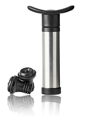 Bomba de vacío elaborada de acero inoxidable + plástico ABS, incluye 2 tapones de vino elaborado de silicona. Permite preservar el vino en óptimas condiciones una vez abierta la botella, retrasando el proceso de oxidación.