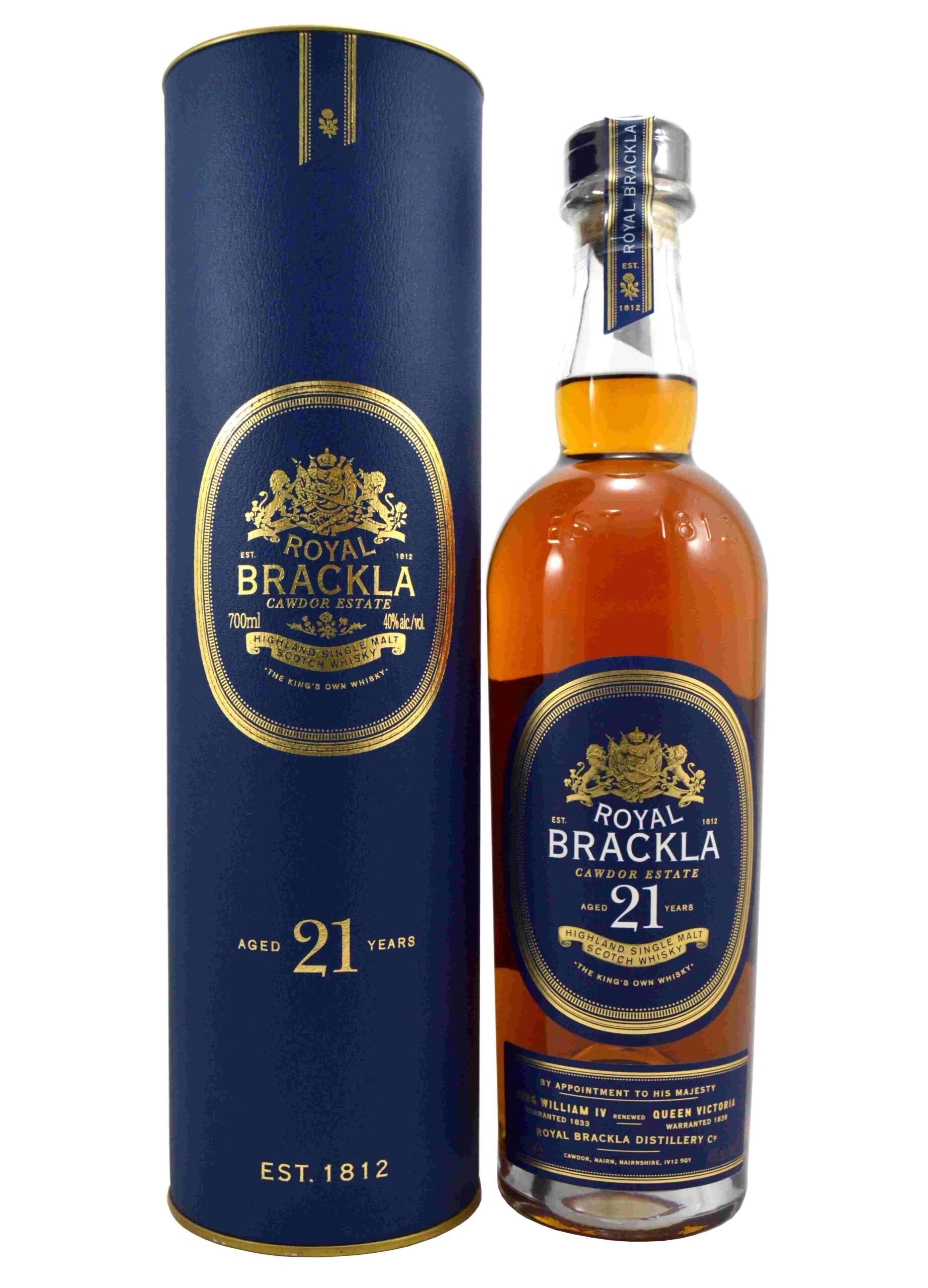 Royal Brackla 21 años, es un whisky single malt terminado en una combinación de barricas de Jerez Oloroso, Palo Cortado y Pedro Ximénez. Posee notas almibaradas de caramelo, con ricas fragancias de bayas de verano calentadas por el sol y espolvoreadas con canela y azúcar moscovado.