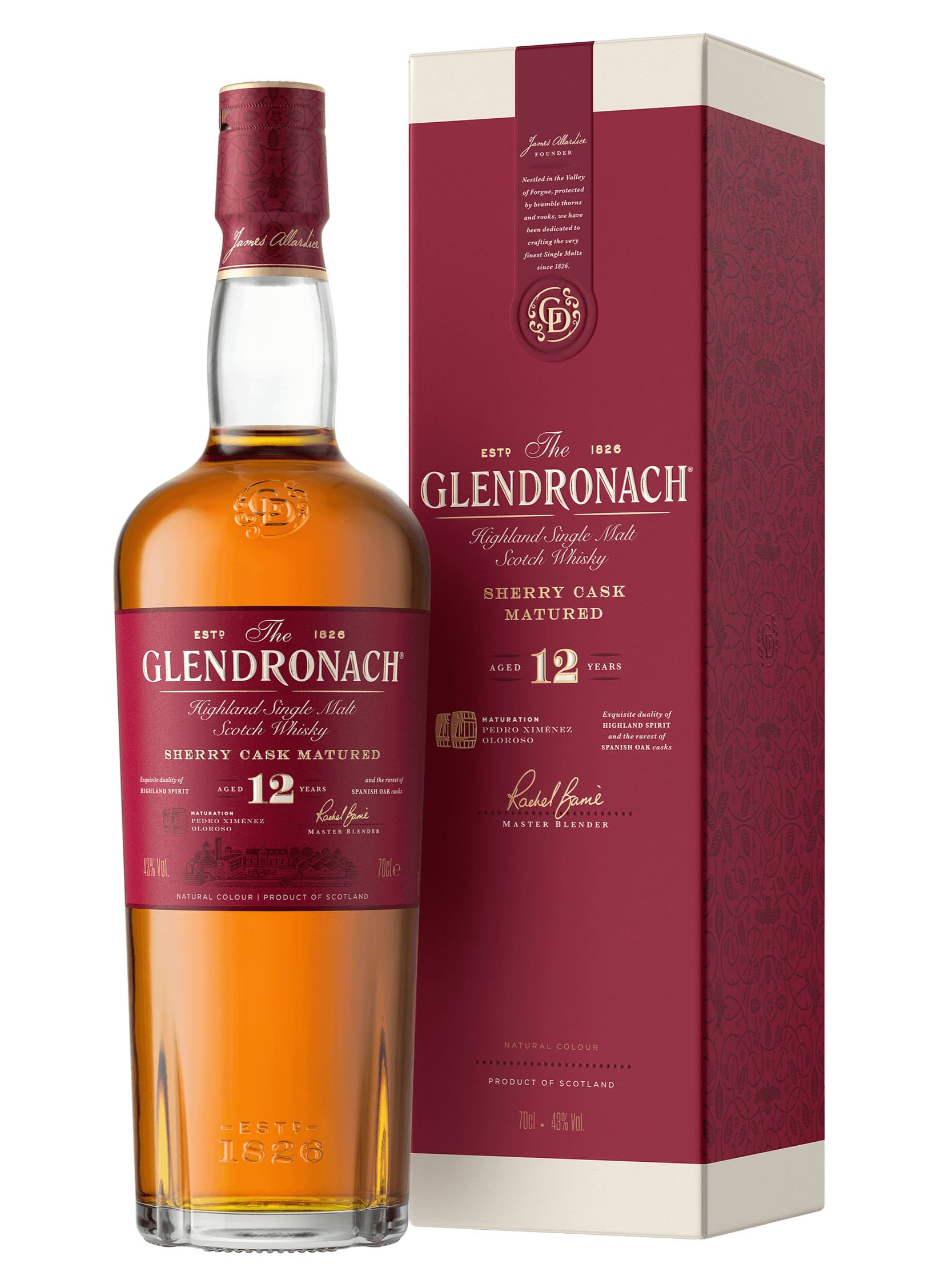 Glendronach 12 Years Old es un whisky tipo Single Malt ajerezado, con 12 años de madurez, como mínimo, en una combinación de las mejores barricas españolas de Pedro Ximénez y Jerez Oloroso. Perfecto grado de alcohol.