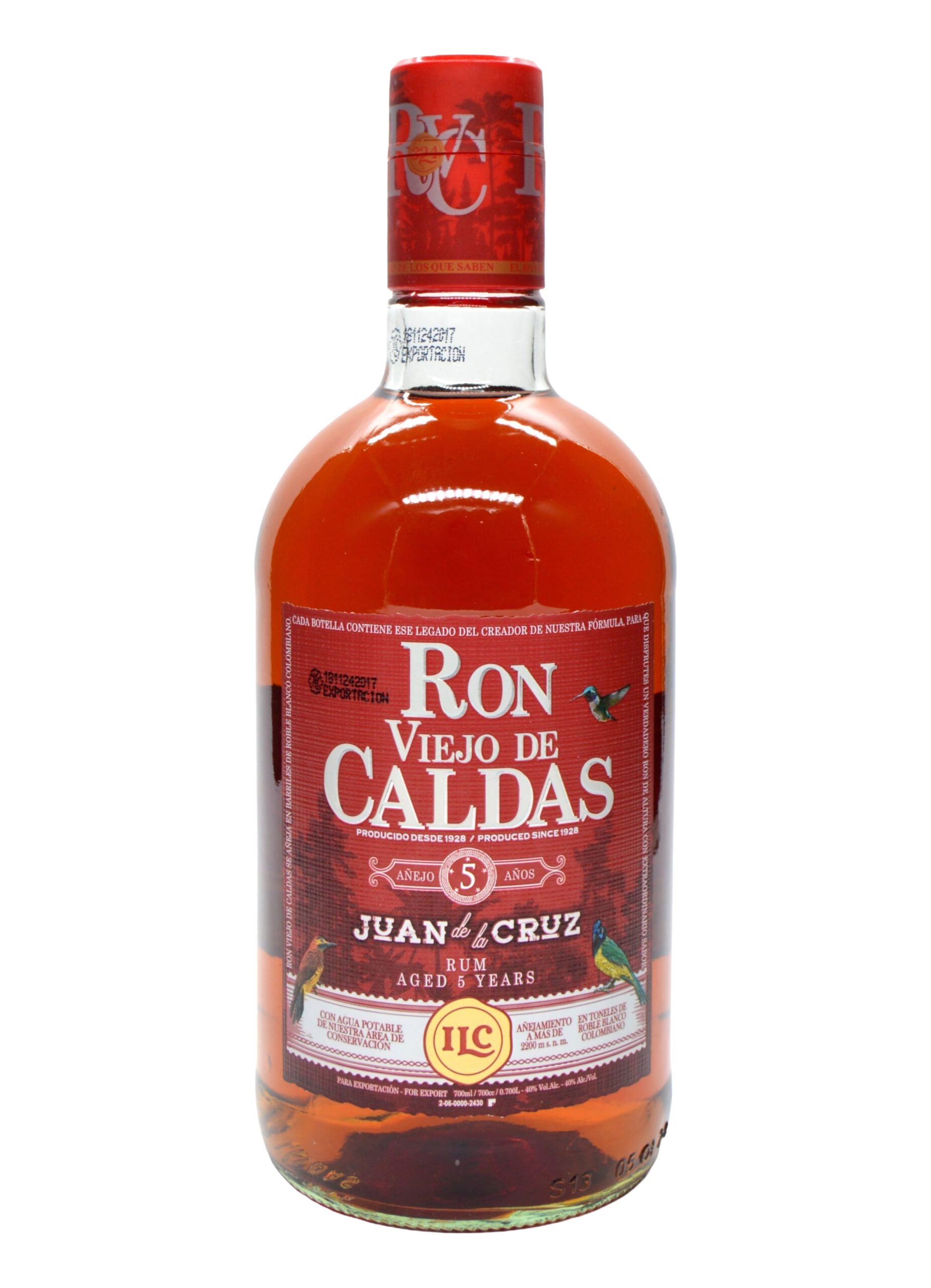 El Ron Viejo de Caldas 5 años es elaborado con alcohol destilado en la compañía caldense, y para ello, se utiliza miel virgen de caña de azúcar. El Ron es añejado en barriles de roble blanco colombiano de primer uso durante un mínimo de 5 años, a 2200 metros de altura sobre el nivel del mar, lo que le da unas características únicas. El agua con que se produce es propia, emanada de la Cordillera de los Andes de manantiales puros que circundan los terrenos de la compañía.