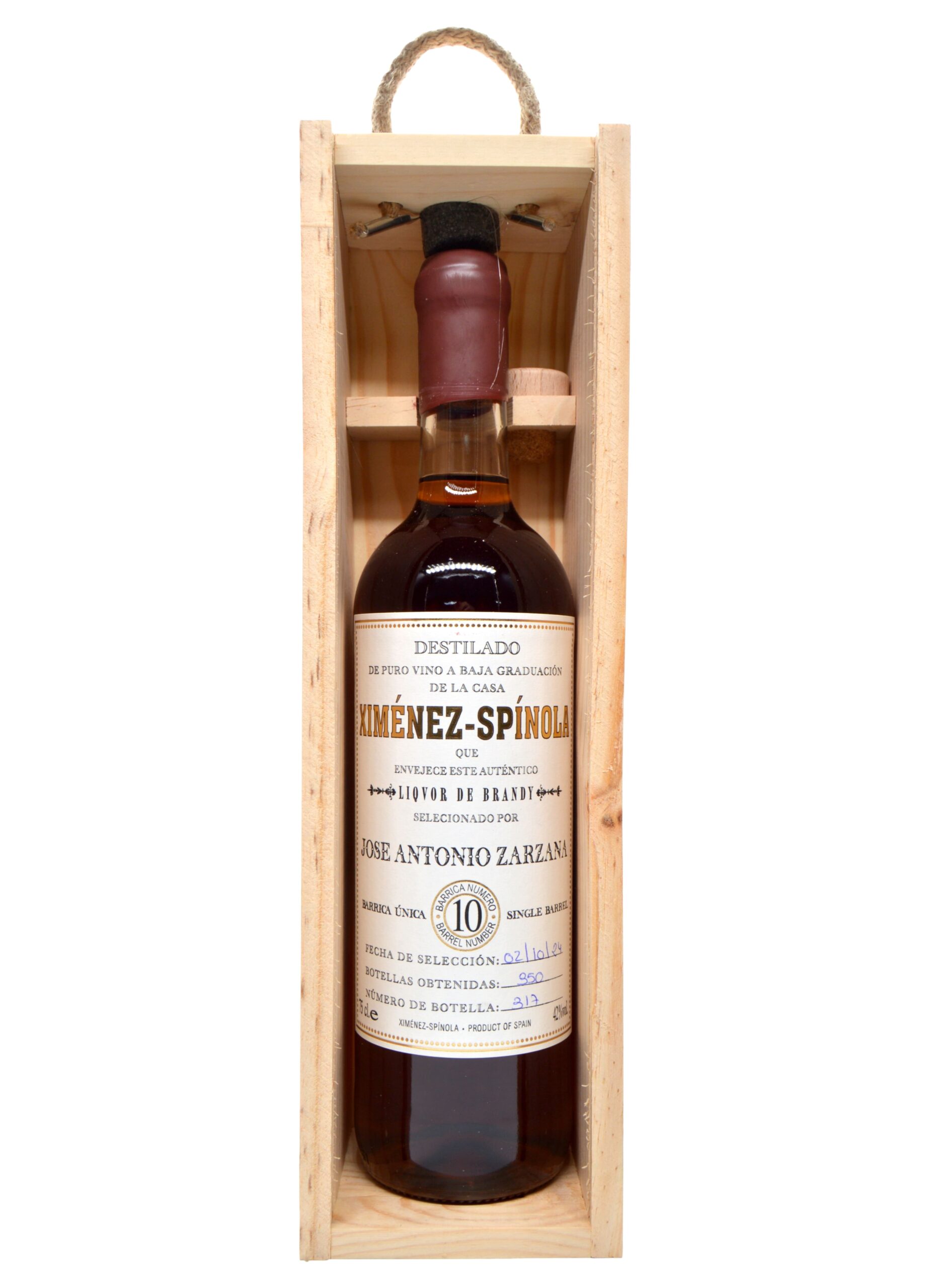 Ximénez Spínola José Antonio Zarzana Barrica Nº 10, es un brandy que se autoriza a embotellar la saca anual de la barrica única seleccionada de entre las veinte de su tipología, que con características organolépticas diferenciadas, se elaboran, envejecen y custodian en su bodega. Y para dejar comstancia, han sido autentificadas todas las botellas obtenidas en el presente año.